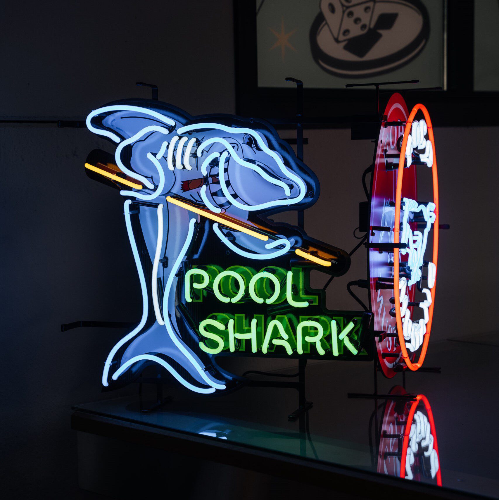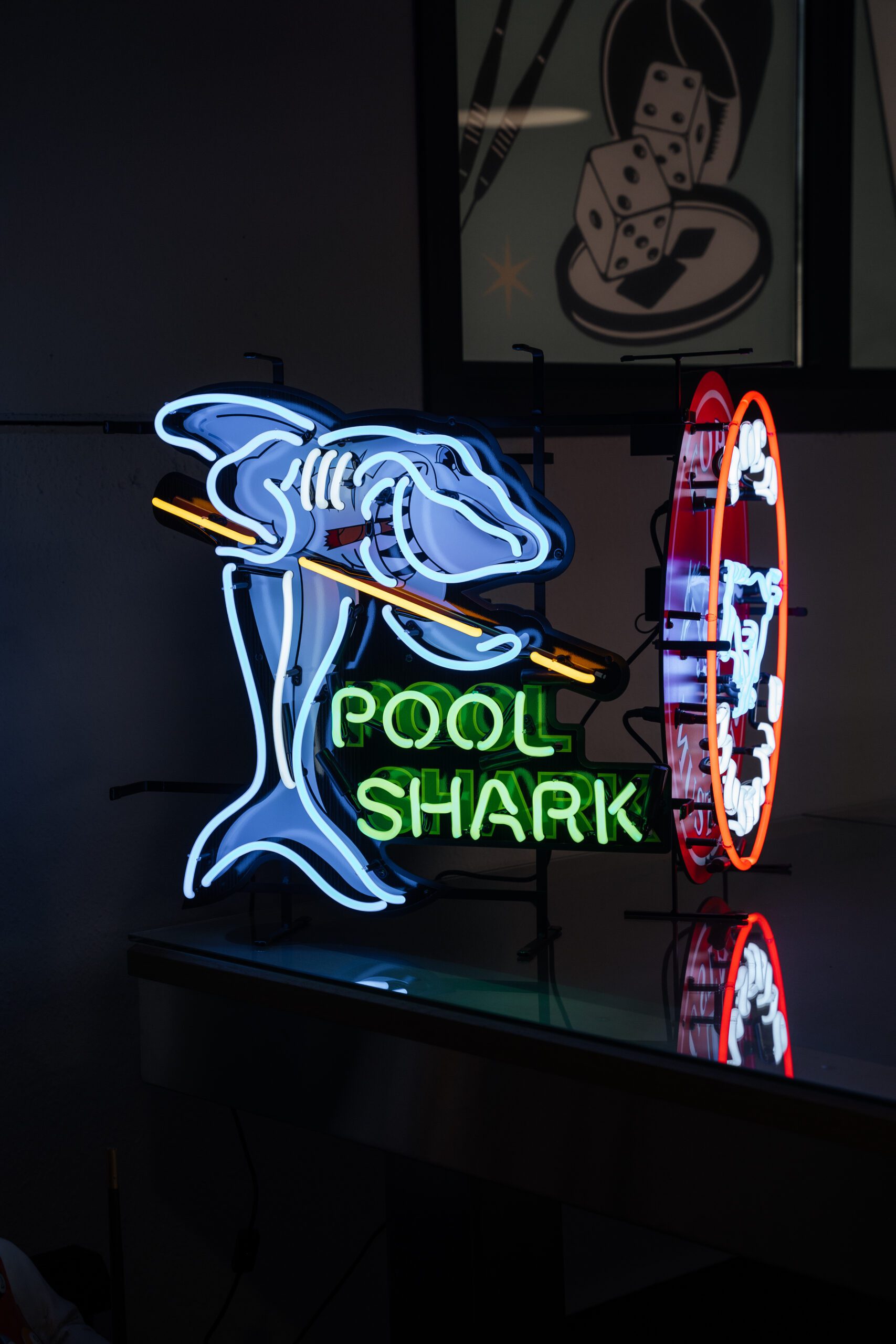 Deze neon verlichting toont een grappige interpretatie van een pool shark: een grijnzende haai die een spelletje pool speelt. Dit humoristische beeld is gegarandeerd een gespreksonderwerp en zal een lach op het gezicht van elke bezoeker toveren.